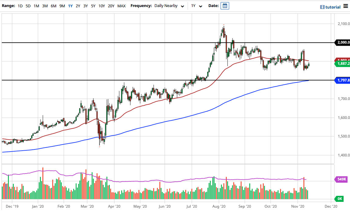 Gold markets rallied during the trading session on Friday, breaking above the highs of the previous three sessions from the week. This is a bullish sign, but we gave back some of the gains at the end, so it is possible that we are simply just now trying to break out of a short-term base. Remember, the Monday candlestick was very vicious to the downside and will have scared quite a few people. It was built upon the premise that the vaccine was going to come in and save everybody, so the economy was going to go screaming to the upside and there was no need for safety. Reality has set back in, as even under the best of circumstances, the vaccine is several months away.