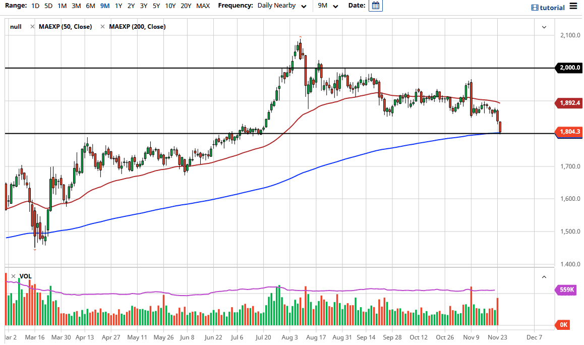 Gold markets got absolutely crushed during the trading session on Tuesday as we reached down towards the $1800 level. That is a large, round, psychologically significant figure, but if you have been following my analyses for some time you know that this is an area in which I was very interested.