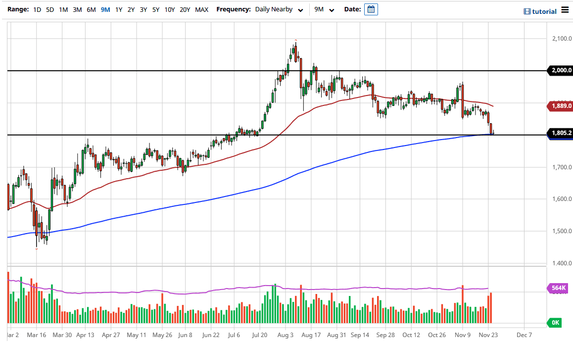 This is a very interesting level which could set the tone for the next few weeks, if not months. We are sitting right at a large, round, psychologically significant figure in the form of the $1800 level, but we are also at the same area in which the market initially broke out to make its run past $2000. You would expect a certain amount of support and, so far, it has held. But it has not bounced that hard. We also have the 200-day EMA sitting there, which could cause some support as well. If there is a place where the stars are aligning for a long position, it is right here.