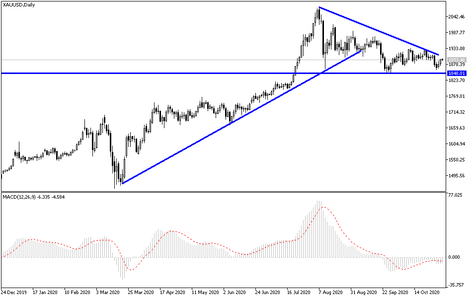 Despite the continued USD strength, the price of gold found an opportunity (although limited) to rebound higher. It tested the $1898 an ounce level in early trading today before stabilizing around $1891 an ounce at the time of this writing. Today is an important date for the price of gold, with the US presidential elections determining the fate of the USD and gold. The price of gold may remain moving in a limited range and instability until the results of those elections are announced. What contributed to the recent gains in gold were increased concerns about the increase in coronavirus cases and new lockdown restrictions in several places across Europe, which increased investors' demand for gold as a safe haven.