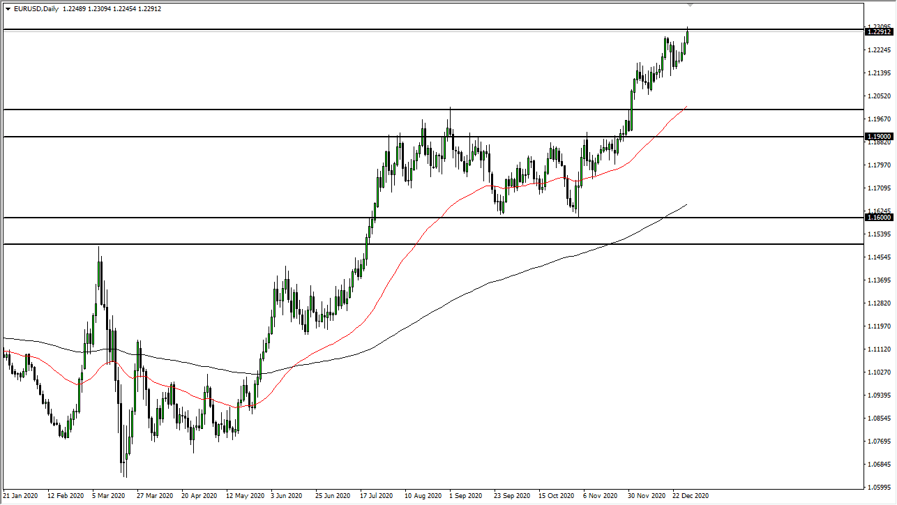 The market did pull back a bit from the 1.23 level, which suggests that we do not have the momentum yet. What I find interesting is that the US dollar is getting crushed in general, and now we are squeezing against a major area. It is worth paying attention to the fact that, at the same time, the British pound looks as if it is getting closer to breaking out, so the real trade may not be in this market, it may be in the EUR/GBP pair. Keep an eye on that currency pair and take a look at the US dollar. Pick which one of the European currencies are doing better, and trade it against the greenback. I do believe that the euro will take off to the upside, but this is a major area to pay attention to on longer-term charts.