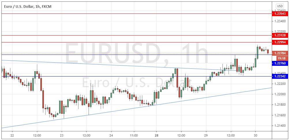 This was enough to keep out of trouble. The price did not close above that level but has broken up above it during the Asian session, and we now see what appears to be higher support at 1.2276 which is holding so far. This is a bullish sign and I think everything now depends upon whether the price can close above 1.2268 at the end of today’s New York session – if so, I will get firmly bullish on this currency pair as it will represent a new 2.5-year high closing price which is undoubtedly bullish.