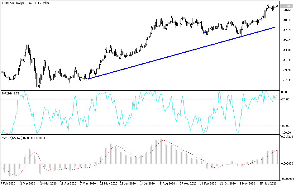 Similar to last week’s performance, the EUR/USD pair completed the upward correction, which is the closest to the last resistance level of 1.2177, its highest since April 2018. The pair is waiting for any developments in investor’s risk appetite following the approval of coronavirus vaccines and ahead of economic releases. After recent gains, fundamental and technical analysts expect the pair to head towards new highs for the year 2020 after the euro succeeded in navigating a wave of political and economic fluctuations, in which COVID-19 was a major factor.