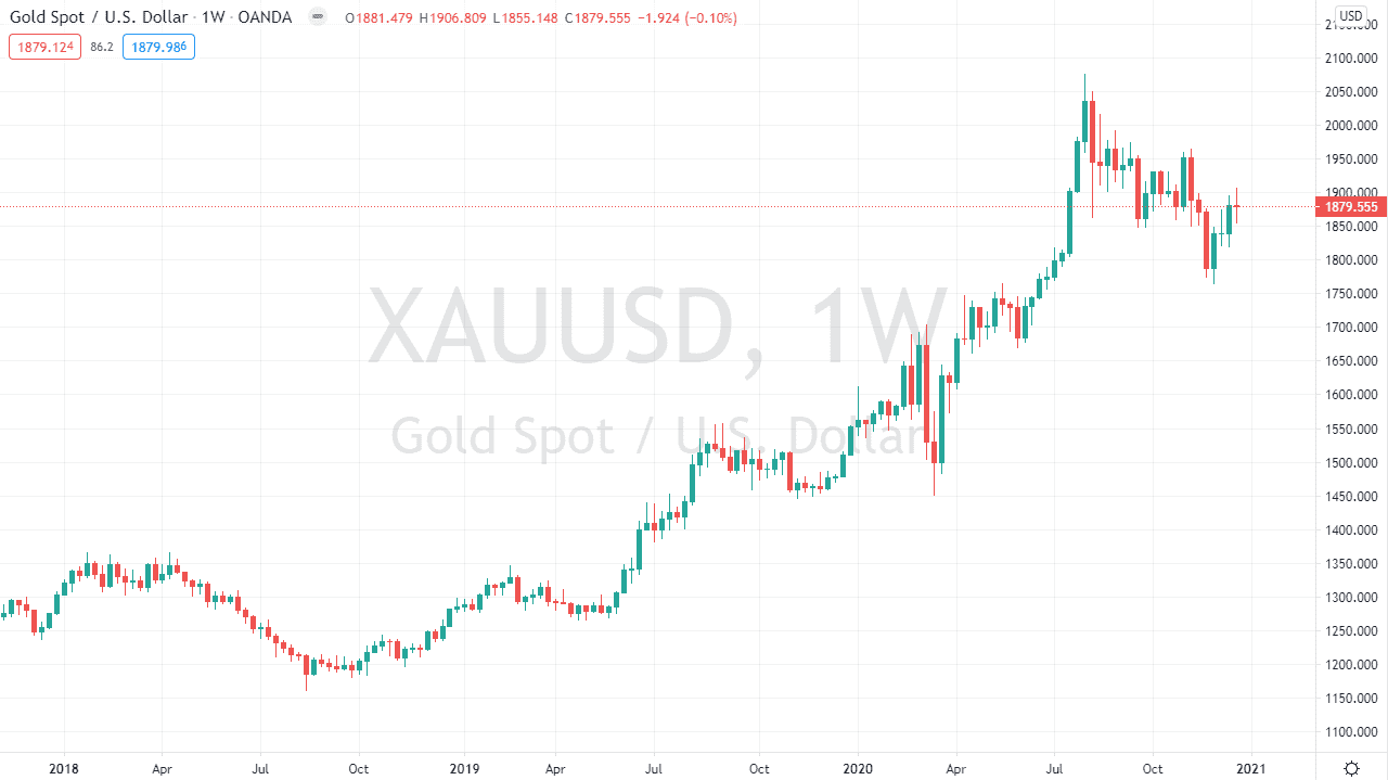 Speaking of the stimulus, you should keep in mind that even though nothing has been signed quite yet, it is only a matter of time before we get there. Even if Trump does not sign the stimulus, it is only a matter of time before Joe Biden would. We are most certainly going to get stimulus and that should continue to help boost gold. A short-term pullback between now and then is only more than likely going to offer value. Beyond that, there are so many different things going on around the world right now that it is hard to argue with the idea of a potential “safety trade” coming into play that should pick up gold as well. By the end of January, gold should be higher, rather than lower.
