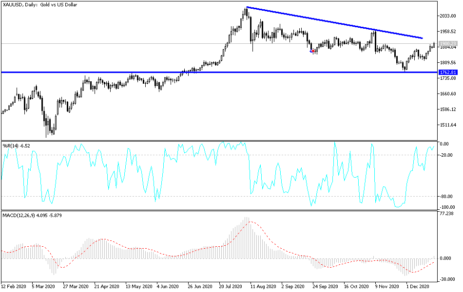 Investors are returning to risk aversion amid new global restrictions to contain the coronavirus outbreak and the emergence of more widespread strains of the disease in conjunction with the annual holiday season. The return of anxiety, along with the dollar’s decline, contributed to pushing the gold price to the $1907 resistance, its highest level in a month-and-a-half. There is no doubt that the stability of the yellow metal price above the resistance will relaunch the increase in purchases, and we do not rule out further gains, especially if the new strains of the COVID-19 pandemic reject vaccines. Recently, gold trading has been interacting with the increasing optimism of global financial markets amid positive developments regarding the COVID-19 vaccine. However, recent US economic data provided mixed results, which boosted gold's gains.
