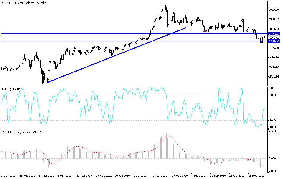 On the daily chart, the price of gold began to form an ascending channel opposing the recent collapse, and is so far stable above $1800 an ounce in support of this trend. However, the pressures remain as optimism continues amid positive news of vaccines. Meanwhile, the recent collapse of the US dollar may not last long. The price of gold still needs to move towards the resistance levels at 1855 and 1900, respectively, in order for the bulls to take control. On the downside, failure to move above the $1800 resistance and moving below it will increase the bears' control over the performance again and continue to move in the same path as the November trading.