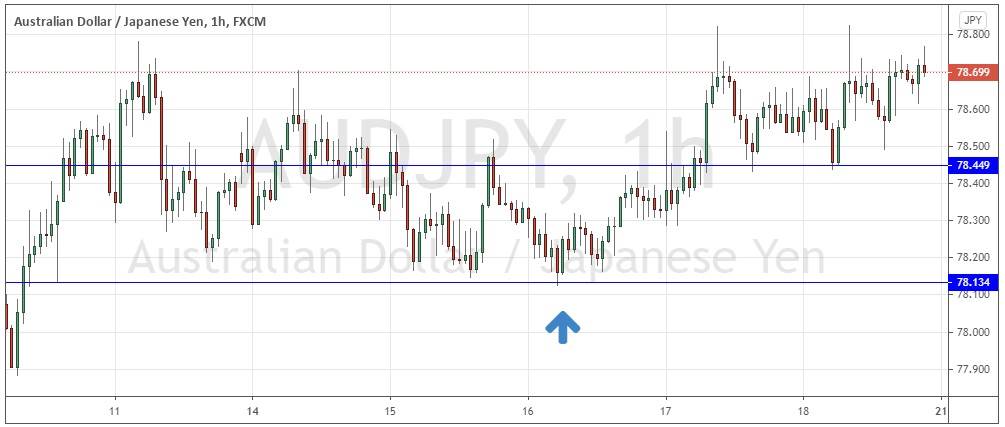 We had expected the level at 78.13 might act as support, as it had acted previously as both support and resistance. Note how these “flipping” levels can work well. The H1 chart below shows how the price rejected this level with a bullish engulfing candlestick structure late during last Tuesday’s Tokyo session, which is typically a good time to be trading major Asian currency crosses such as this one. This trade has been nicely profitable, achieving a maximum positive reward to risk ratio of about 3 to 1 based upon the size of the entry candlestick structure.
