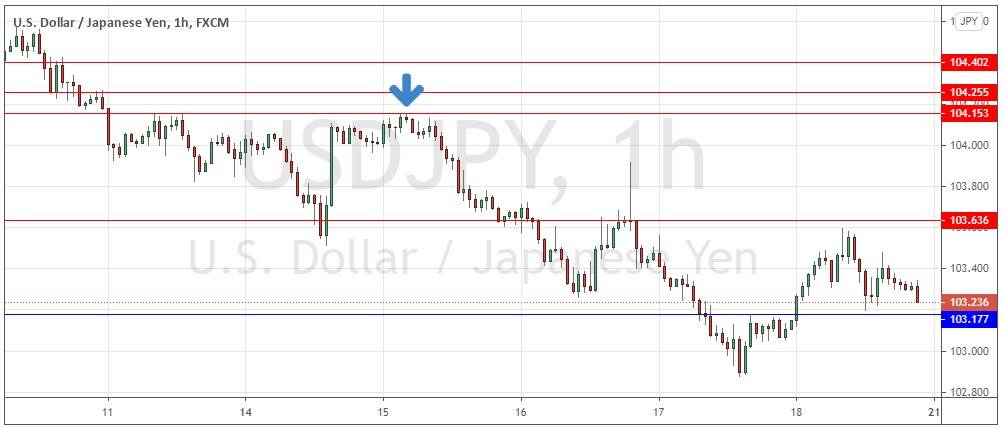 We had expected the level at 104.15 might act as resistance, as it had acted previously as both support and resistance. Note how these “flipping” levels can work well. The H1 chart below shows how the price rejected this level with a small bearish near-doji pin candlestick during last Monday’s Tokyo session, marked by the down arrow in the price chart below, which is typically a good time to be trading Japanese yen currency pairs or crosses such as this one. This trade was very profitable, achieving a maximum positive reward to risk ratio of more than 12 to 1 so far based upon the size of the entry candlestick.