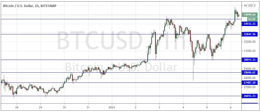 The price has continued to advance bullishly to new highs above the big round number at $35,000. Although volatility remains relatively very high, there are no clear signs of climax and exhaustion, so as we are trading into the blue sky of all-time highs, there is no reason not to take a bullish bias here and look to enter new long trades at pullbacks to the new key support levels nearby which I have identified above.