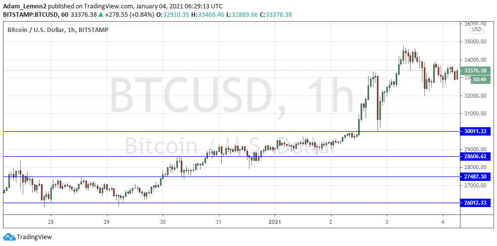 This was a good call as the price has risen by almost 20% since then, making a short-term peak yesterday just below $35,000, which may prove to be resistant as a major psychological level and round number.
