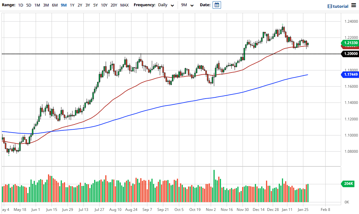 To the downside, I do believe that there is a significant amount of support extending from the 1.20 level underneath down to the 1.19 level, as we have seen it offer significant resistance in the past. That being said, if we were to break down below there then I think that the market probably then finds its way down to the 200 day EMA. To the upside, the 1.23 level extends all the way to the 1.25 level as far as resistance. If we were to break above the 1.25 handle, then the market is likely to go much higher, perhaps extending all the way to the 1.30 level but that needs some type of severe “anti-US dollar” type of situation. I think range bound trading systems will continue to be the best way forward.