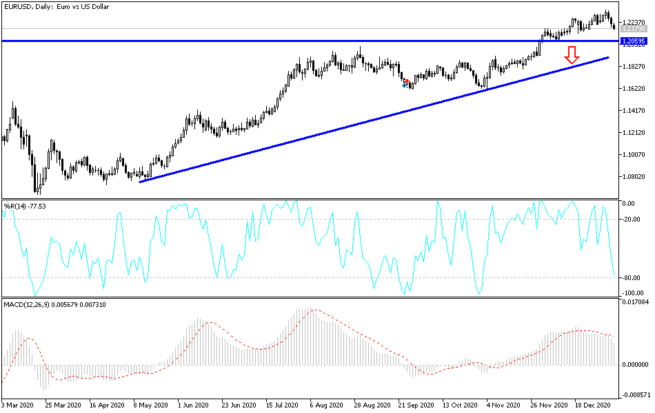 At the beginning of this week's trading, the EUR/USD pair retreated to the support level of 1.2170 as of this writing. The first trading week of 2021 was strongly positive for the pair, as the currency pair jumped to the resistance level of 1.2350, its highest since April of 2018. However, this positivity was impacted by a strong setback for the US labor market and the spread of coronavirus, which led to more restrictions and the crippling of European economies.
