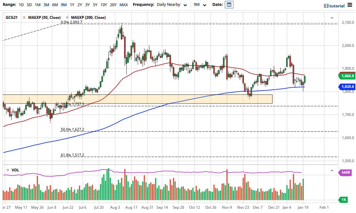 Gold markets have broken higher during the trading session on Wednesday, breaking towards the 50 day EMA. That of course is a large figure on the technical analysis background, but it should be noted that the market is essentially sideways. All things being equal, if we can break above the 50 day EMA then it opens up a possible move towards the $1900 level. I think at this point in time that probably is what happens next. This does not mean that we cannot pull back, and I think at this point time that would make quite a bit of sense. To the downside, I see the 200 day EMA sitting at the $1820 level, which has offered support previously as we formed a hammer at that level on Tuesday. Ultimately, I think this is a sign that we will continue.