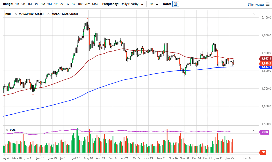 That being said, if we can break above the 50 day EMA, then the market is likely to go looking towards the $1900 level. If we can break above there, then the market is likely to go looking towards the $1960 level. That being said, I think it is going to be very noisy on the way up there, and because of this I think that you have the ability and the time to simply add little bits and pieces along the way in order to build up a bigger position for once we finally do break out. The gold market is one that I have no interest in shorting, although I do recognize that it is struggling. That being said, pay close attention to the 10 year note, and the interest rate. If it continues to rise, that is toxic for gold.