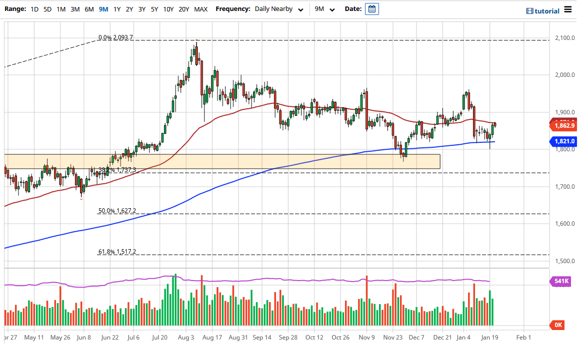 Gold markets pulled back just a bit during the trading session on Thursday but still looks somewhat bullish and it certainly looks as if it is trying to build some type of base. This is all based upon stimulus of course, and the idea that central banks around the world are going to continue to flood the markets with cheap currency. As they devalue fiat currency, that drives up the demand for precious metals and “things.” Gold is certainly one of the first places that people will be running towards, but it should be noted that during the day on Thursday Mitt Romney and Lisa Murkowski both suggested that they are not necessarily looking to get into some type of big rush to do stimulus in the US Senate. In other words, stimulus may be on hold. At the very least, I do not think that Joe Biden get his $1.9 trillion package.