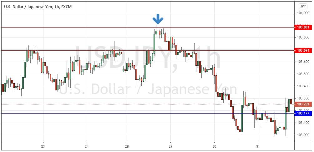 We had expected the level at 103.88 might act as resistance, as it had acted previously as both support and resistance. Note how these “flipping” levels can work well. The H1 chart below shows how the price rejected this level with a bearish inside candlestick structure during last Monday’s London/New York sessions overlap, marked by the down arrow in the price chart below, which is typically a good time to be trading major currency pairs such as this one. This trade has been profitable, achieving a maximum positive reward to risk ratio of approximately 8 to 1 so far based upon the size of the entry candlestick structure.