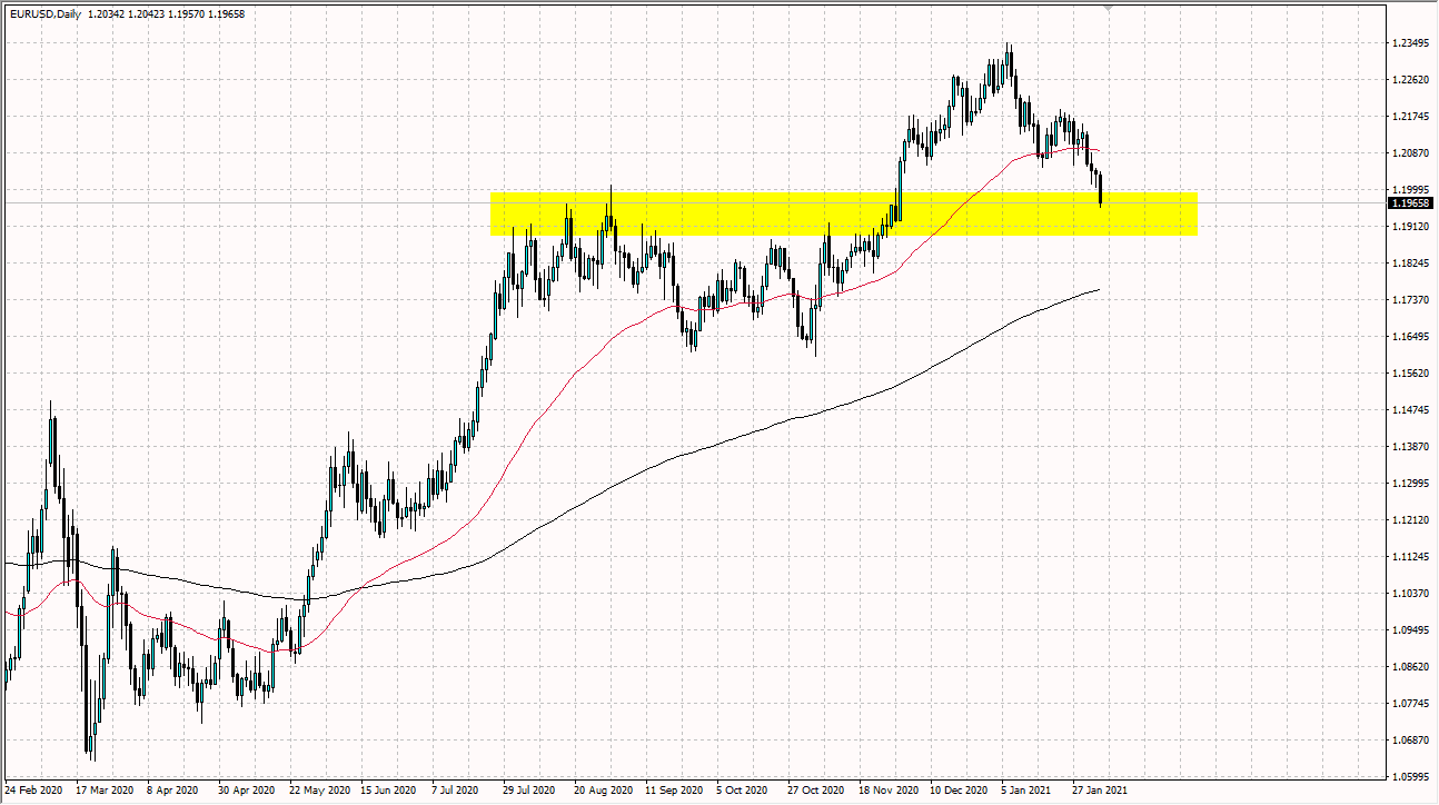 The Euro has broken down below the 1.20 level during the trading session on Thursday, as it looks like we are going to continue to see a lot of volatility in this pair. When you look at this chart, you can see that I have yellow box on it, and I believe that it signifies where all of the support should be. The area between 1.20 and 1.9 is essentially a “thick zone of potential support.” This is because it behaved like a “thick zone of resistance” previously.