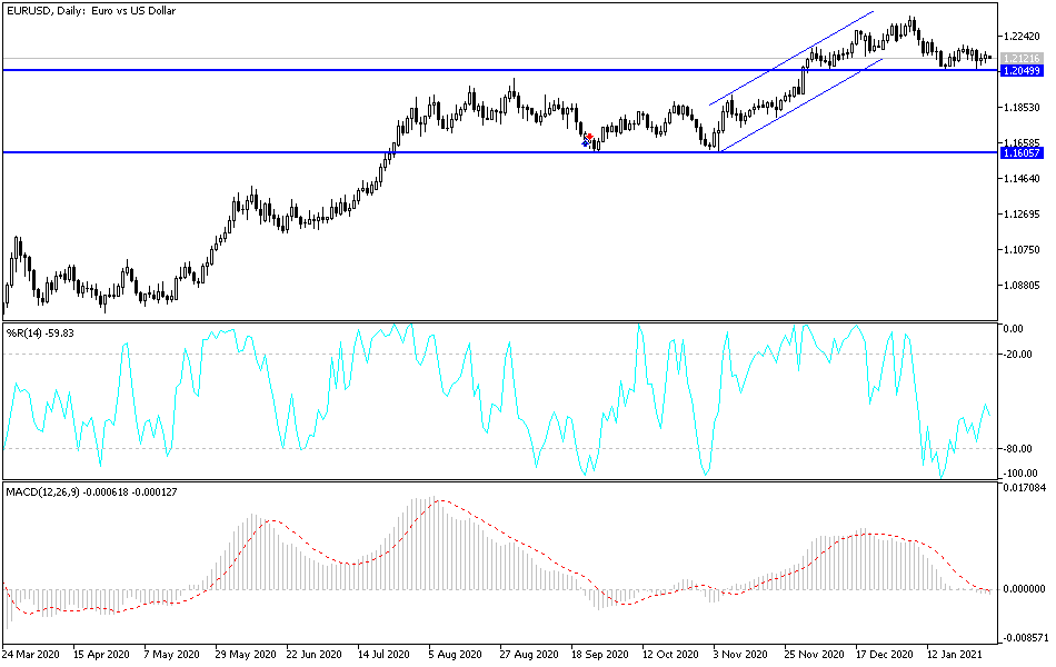 The bearish performance of the EUR/USD pushed the pair to the 1.2058 support level last week, but cut its losses and closed the week’s trading around the 1.2135 level after trying to rebound to the 1.2160 resistance. The euro has been negatively affected by the obstacles facing the European vaccination rollout, at a time when the European continent is suffering from record numbers of injuries and deaths from the epidemic. This is in addition to the weak economic expectations even with the emergence of vaccines, especially those expectations received from the largest economy in the Eurozone.