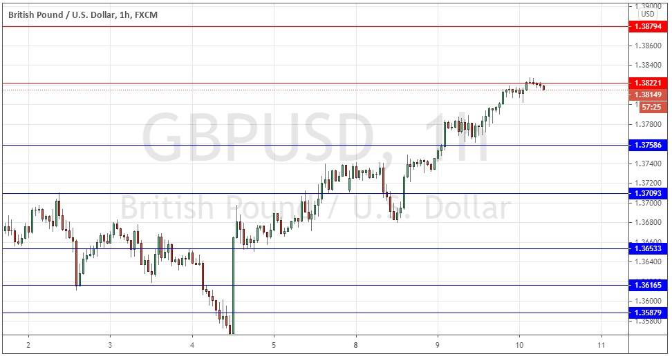 Last Monday’s GBP/USD signals were not triggered, as there was no bullish price action when the support level at 1.3709 was first reached that day.