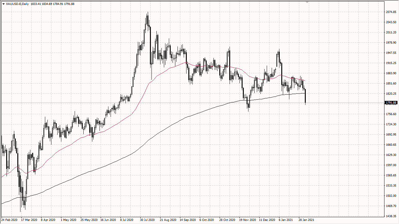 The gold markets have broken down significantly during the course of the trading session on Thursday to slice through the 200 day EMA quite handily. The gold markets are getting punished due to the fact that the US dollar has risen quite stringently, and then of course interest rates in the United States are rising. All this is toxic for gold, and as a result it is likely that the market will continue to press lower. If it does, there is a bit of a “line in the sand at the $1750 level.