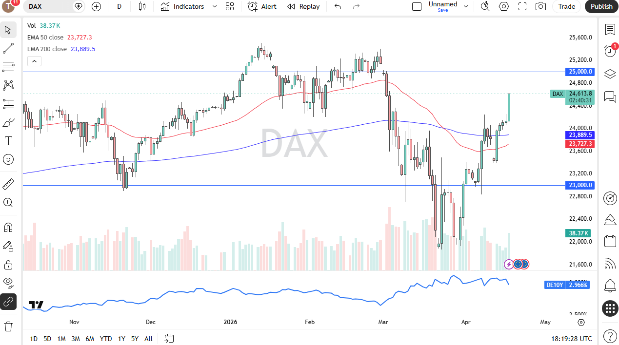 Given it enough time, I do think that we will eventually see this market reach towards the 25,000 level and then break above there. I’m very cognizant of the fact that traders continue to be very jittery, but we have seen a massive amount of upward momentum and the size of the candle right along with the volume does tell me that it’s likely that we will see continued pressure.
