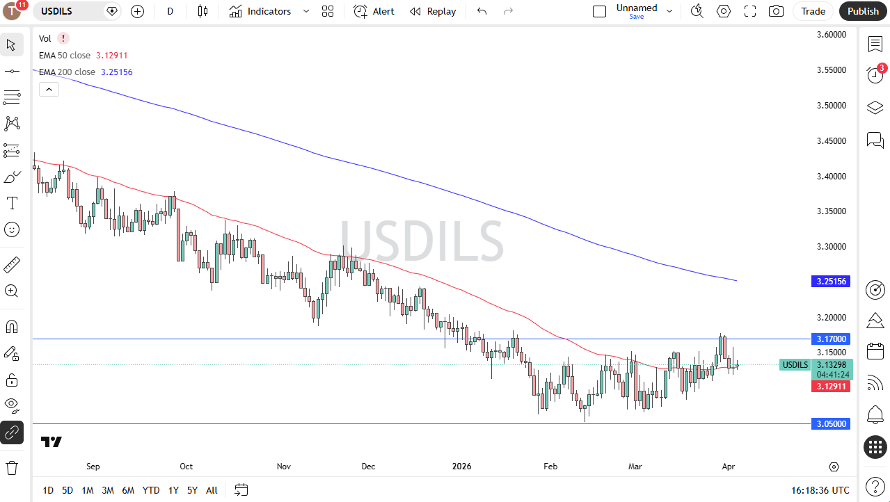 The US dollar has been a little bit choppy against the Israeli shekel on Friday as we are hanging around a couple of major technical areas. The first thing that keeps me focusing on this market is that we are dancing around the 50-day EMA, which of course is a major technical analysis indicator that a lot of people watch very closely for dynamic support and resistance.